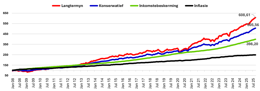 Die grafiek hier onder toon die laaste agt jaar die hipotetiese opbrengs van ’n R100 belegging vanaf 1 Januarie 2008 tot 30 September 2025 (213 maande). Let op hoe wisselvallig die langtermyn-portefeulje ((rooi)) is, maar oor tyd wel die ander portefeuljes uitpresteer. Die doel van die grafiek is bloot om die verskil (met gebruikmaking van die werklike opbrengste van die Predikante Pensioenfonds) tussen die verskillende portefeuljes te illustreer. Die R100 sou teen 30 September 2025 R608,61 in die langtermyn-portefeulje gewees het. As die R100 dalk R1 miljoen was, sou dit op 30 September 2025 R6,1 miljoen gewees het (ensovoorts). Die inkomstebeskerming-portefeulje se groei was meer stabiel, maar oor die langtermyn (hierdie 213 maande) sou R100 net tot R398,20 gegroei het. Die konserwatiewe portefeulje kies die middelgrond en eindig na 213 maande met R503,56.